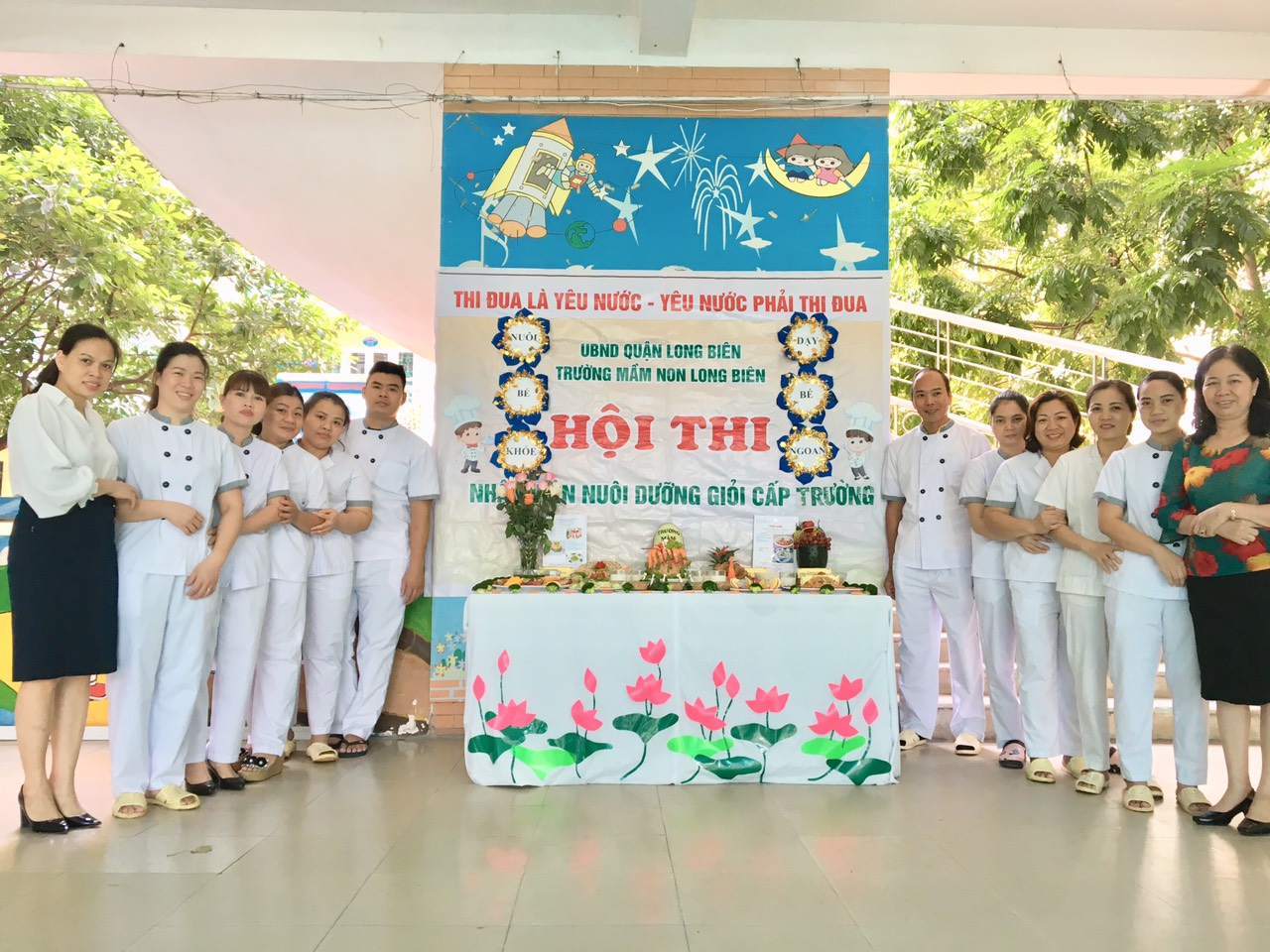 Sinh thời, Chủ tịch Hồ Chí Minh luôn đề cao tinh thần nêu gương của đội ngũ cán bộ, Đảng viên. Bác chỉ rõ “Đảng viên đi trước, làng nước theo sau”. Để hoàn thành mọi nhiệm vụ của nhà trường đó là sự chỉ đạo của chi bộ đảng, Ban giám hiệu nhà trường, sự phối hợp của Ban chấp hành Công đoàn, chi đoàn thanh niên trong mọi hoạt động.... Đồng chí Đỗ Thị Thanh Nhâm Bí thư chi bộ - Hiệu trưởng nhà trường luôn đi đầu và gương mẫu trong công việc, các phong trào của nhà trường, không ngại khó ngại khổ, luôn bắt tay cùng làm và hướng dẫn đồng nghiệp từ việc lao động vệ sinh, sơn đồ chơi ngoài trời đến các hoạt động, phong trào hội thi.... Để đưa các phong trào thi đua của nhà trường đi lên, đời sống, tinh thần của CBGVNV ngày càng nâng cao, xây dựng “Nhà trường văn hóa – nhà giáo mẫu mực”. Ban giám hiệu cùng Công đoàn, chi đoàn thanh niên phát động và đi đầu trong phong trào xây dựng nhà trường “Sáng – xanh – sạch – đẹp – nở hoa.