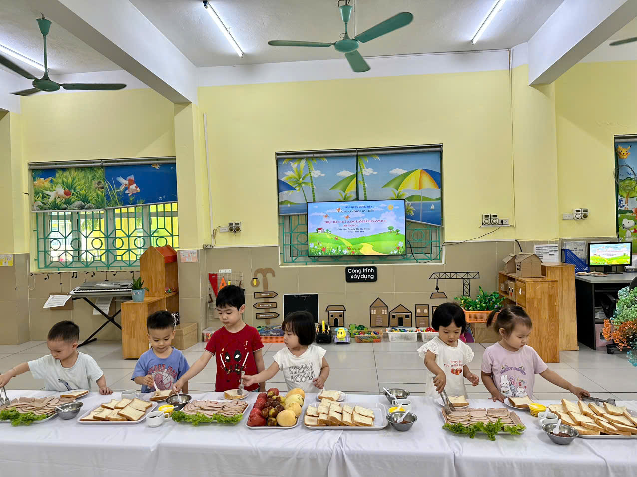 Với những nguyên liệu rất gần gũi với trẻ đã được các cô chuẩn bị sẵn như: Pate, giò, rau xà lách, rau thơm, siro,…các bé lớp mẫu giáo bé C4 được tự tay làm những miếng bánh mì sandwich kẹp theo ý thích của mình. Những bàn tay nhỏ bé với sự hướng dẫn và động viên, khích lệ của cô giáo, các bé đã rất thích thú, tự tin thực hành cách phết pate, xếp xúc xích và khéo léo xếp bánh sandwich vào máy nướng bánh ... tạo nên những chiếc bánh mì kẹp thơm ngon, tất cả tạo nên một hoạt động thật hứng thú nhưng không kém phần hấp dẫn.