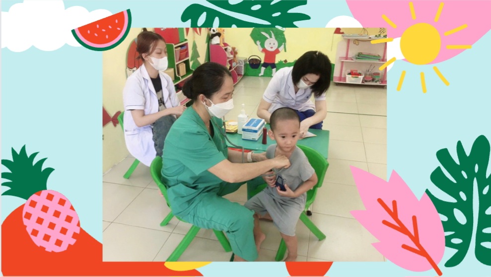 Ngày 5/10/ 2023 Trường Mầm non Long Biên phối hợp với Trạm Y tế Phường Long Biên tổ chức khám sức khỏe định kỳ cho 100% các cháu trong nhà trường với các nội dung kiểm tra: khám tai, mắt, mũi, họng, kiểm tra tim phổi và một số bệnh liên quan đến đường hô hấp, da liễu ...