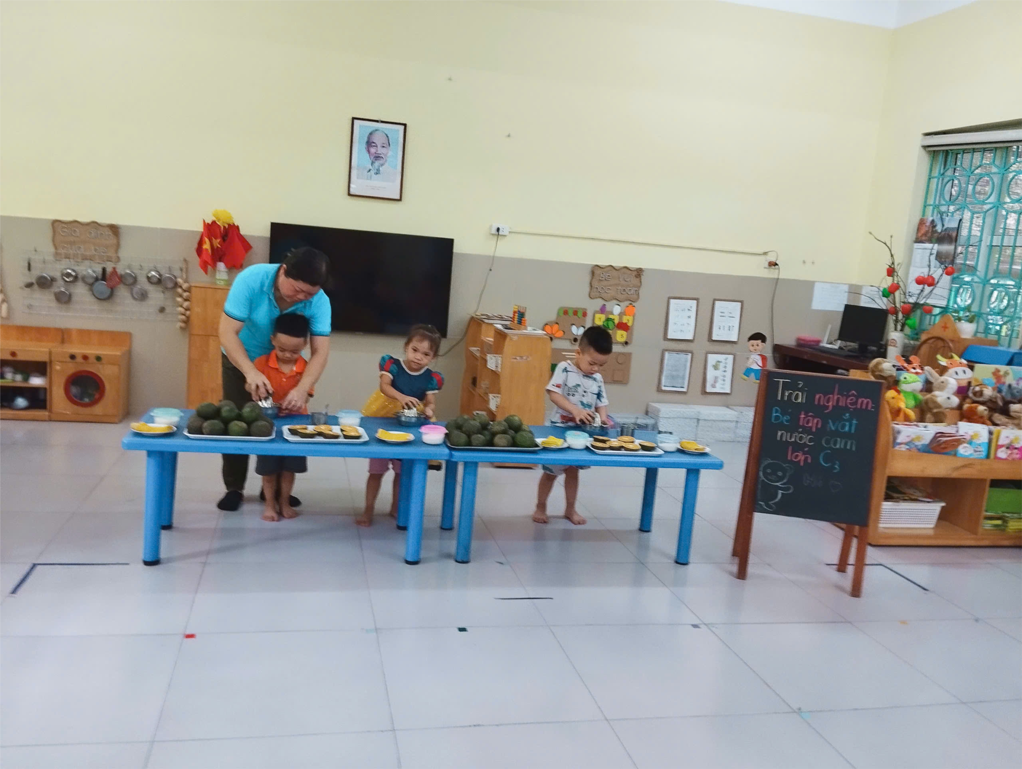 Đây là một trong những hoạt động rất hấp dẫn đối với các bé bởi vì các bé được tự tay làm món nước uống bổ dưỡng. Trong hoạt động này các bé sẽ được làm quen với dụng cụ vắt cam và được cô giáo hướng dẫn cụ thể từng kĩ năng xoay, cầm để vắt cam sao cho hết nước trong miếng cam. Qua hoạt động thú vị này, cô giáo giúp các bé hiểu được muốn cơ thể khoẻ mạnh và lớn lên cần phải ăn uống đủ chất và cần uống bổ sung các loại nước hoa quả chứa nhiều vitamin. Đặc biệt nước cam có tác dụng giải khát và bồi bổ thể lực vì có nhiều vitamin C. Thông qua hoạt động trải nghiệm “Vắt nước cam” các con đã cùng nhau tận hưởng hương vị ngọt thanh của cốc nước cam do chính tay mình vắt.