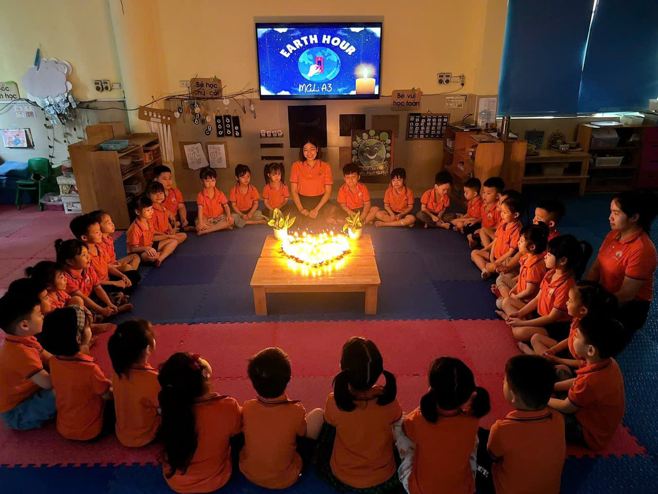 Trong khoảng thời gian hưởng ứng, toàn bộ hệ thống điện trong lớp học được tắt, các hoạt động được chuyển sang hình thức nhẹ nhàng, gần gũi như trò chuyện, kể chuyện và tham gia các trò chơi tập thể. Dưới sự hướng dẫn của giáo viên, trẻ được tìm hiểu ý nghĩa của việc tiết kiệm điện, hiểu rằng mỗi hành động nhỏ như tắt đèn khi không sử dụng cũng góp phần bảo vệ Trái đất, giảm thiểu biến đổi khí hậu.