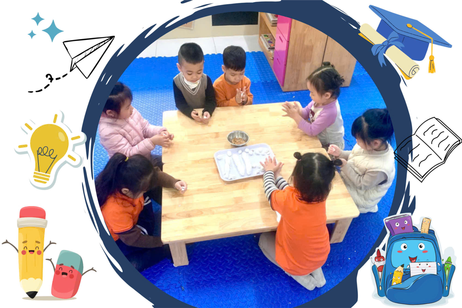 Các con được rèn luyện kỹ năng xoay tròn và làm ra những viên bánh trôi tròn tròn, xinh xắn trông thật đẹp mắt. Những viên bánh tròn xinh xắn được nặn từ những đôi bàn tay đáng yêu của bé, được bé nâng niu và trân trọng biết bao vì đó chính là thành quả lao động miệt mài của các bé. Sản phẩm của các con được các cô nấu lên cùng nhau thưởng thức.