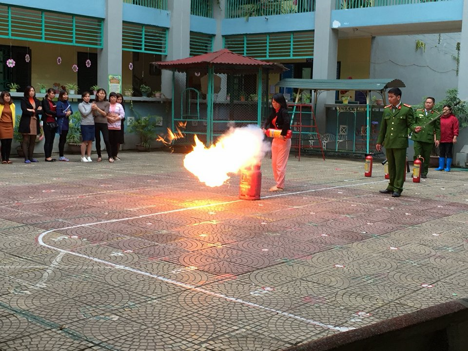 Các cán bộ, giáo viên, nhân viên đã được thực hành cách sử dụng các phương tiện bình bột, bình CO2 để dập tắt đám cháy và cách thức xử lý nhanh các tình huống có thể xảy ra. Cách sử dụng khăn, vải..... để khóa van bình ga đang cháy