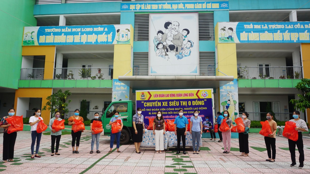 “Chuyến xe siêu thị 0 đồng’ của Liên đoàn lao động quận Long Biên đã trao 15 xuất quà “Túi an sinh Công đoàn” hỗ trợ cho 15 đồng chí giáo viên, nhân viên nhà trường gặp khó khăn do dịch bệnh Covid – 19. Dự và trao quà có đ/c Phạm Bá Vĩnh – Phó Chủ tịch Liên đoàn lao động thành phố Hà Nội, đ/c Đinh Thị Thu Hương – Phó Chủ tịch Ủy ban nhân dân Quận, đ/c PhanThị Thu Hằng – Chủ tịch Liên đoàn lao động Quận, đ/c Nguyễn Thị Hồng Vân- Phó phòng giáo dục và đào tạo quận Long Biên. Món quà “Túi an sinh công đoàn” của Liên đoàn lao động quận Long Biên đã được trao đến tay các đồng chí giáo viên, nhân viên, thể hiện tình cảm và mong muốn được chia sẻ phần nào những khó khăn trong chăm lo cuộc sống gia của đoàn viên thật đáng trân trọng.