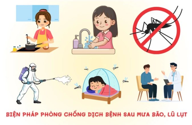 Trong và sau bão, mưa lũ, ngập lụt sẽ có rất nhiều vi sinh vật, bụi, rác, chất thải… theo dòng nước tràn ra nhiều nơi, gây ô nhiễm môi trường và tiềm ẩn nhiều nguy cơ dịch bệnh. Hơn nữa, mưa bão và ngập lụt là điều kiện thuận lợi để các loại vi khuẩn, vi rút và trung gian truyền bệnh sinh sôi phát triển, gây bệnh cho con người. Những dịch bệnh thường gặp trong mùa mưa bão là: tiêu chảy cấp, bệnh đường hô hấp, bệnh về mắt, bệnh ngoài da, sốt xuất huyết…