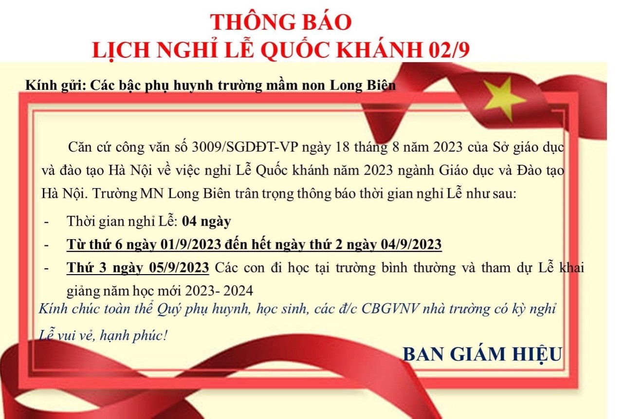 🎉 Nhân dịp kỷ niệm 78 năm ngày Quốc khánh nước Cộng hòa Xã hội chủ nghĩa Việt Nam (2/9/1945 - 2/9/2023), trường mầm non Long Biên xin thông báo đến toàn thể quý Phụ huynh, các con học sinh và CBGVNV về lịch nghỉ Lễ như sau: