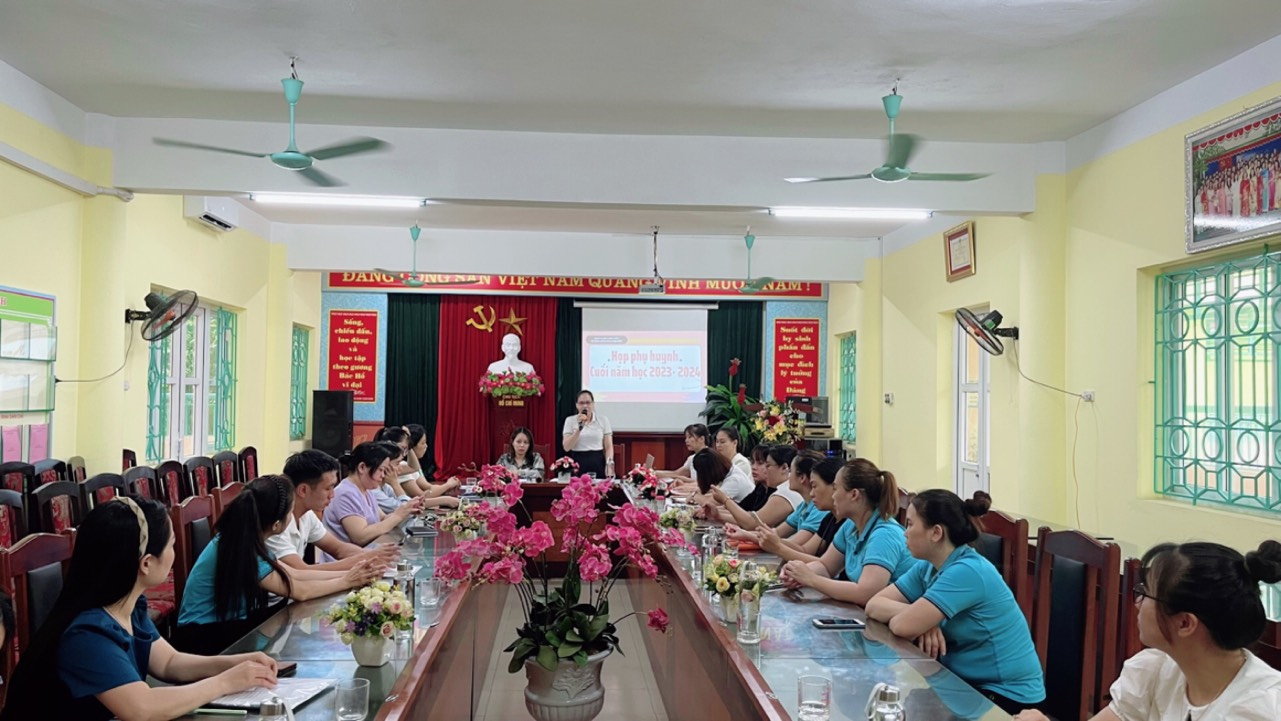 Vào hồi 16h00 ngày 23/5/2024 Ban giám hiệu nhà trường đã họp với trưởng ban cha mẹ học sinh của các lớp tại phòng Hội đồng của nhà trường. Chủ trì cuộc họp là đồng chí Đỗ Thị thanh Nhâm - Bí thư chi bộ - Hiệu trưởng nhà trường. Và sự có mặt của các đồng chí trong Ban giám hiệu cùng đại diện giáo viên, trưởng ban phụ huynh của các lớp. Tại đây, đồng chí Hiệu trưởng đã báo cáo những kết quả đạt được của nhà trường trong năm học vừa qua. Với sự nỗ lực cố gắng phấn đấu của tập thể CBGVNV cùng với sự phối kết hợp ủng hộ nhiệt tình của các bậc phụ huynh nên nhà trường đã đạt được nhiều thành tích trong năm học 2023- 2024. Tiếp theo, bà Nguyễn Thanh Huyền- Trưởng ban đại diện CMHS nhà trường đã báo cáo kết quả hoạt động của Ban phụ huynh trong năm học 2023- 2024 vừa qua đồng thời công khai các khoản thu chi quỹ của BPH.