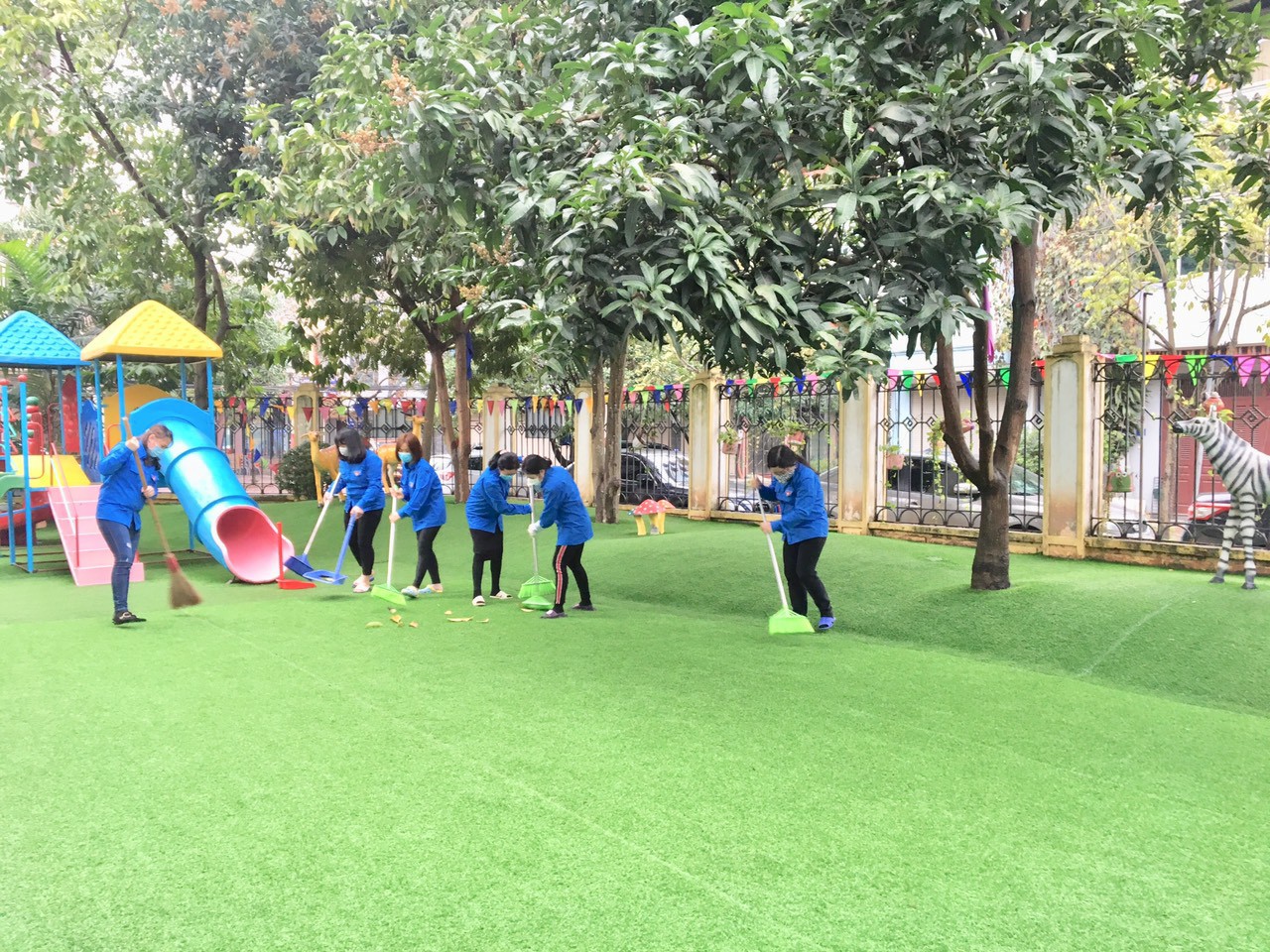 Nhà trường đã thường xuyên tổ chức tổng vệ sinh, khử khuẩn trường học vào chiều thứ sáu hàng tuần tuần và vệ sinh hàng ngày theo Quy chế và khuyến cáo của Bộ y tế, công văn chỉ đạo của cấp trên. Vệ sinh ngoại cảnh: phát quang bụi rậm, không để nước đọng, vệ sinh sân trường, vườn trường, cắt tỉa cây, hoa, nhổ cỏ, vệ sinh các thùng rác, các khu vực kho ga, kho nước, vườn rau, nhà bơm, hố ga,...cổng trường và toàn bộ khu vực bên ngoài xung quanh trường. Tổ chức lau chùi khử khuẩn trường học, lớp học, các phòng chức năng, các hành lang, các khu tiểu cảnh, hiên trước sau, nhà vệ sinh, cầu thang, tay vịn, đồ dùng đồ chơi, dụng cụ học tập và các đồ vật trong phòng học, tranh ảnh, giá kệ, cửa ra vào, cửa sổ, cửa kính, vách kính khu cầu thang các tầng, nền nhà, tường nhà, tay nắm cửa, tay vịn cầu thang, tay vịn lan can, bàn ghế… bằng dung dịch CloraminB và các chất tẩy rửa thông thường: Vệ sinh khăn lau mặt, lau tay, cây nước, tủ cốc, chăn, giường, chiếu của trẻ.
